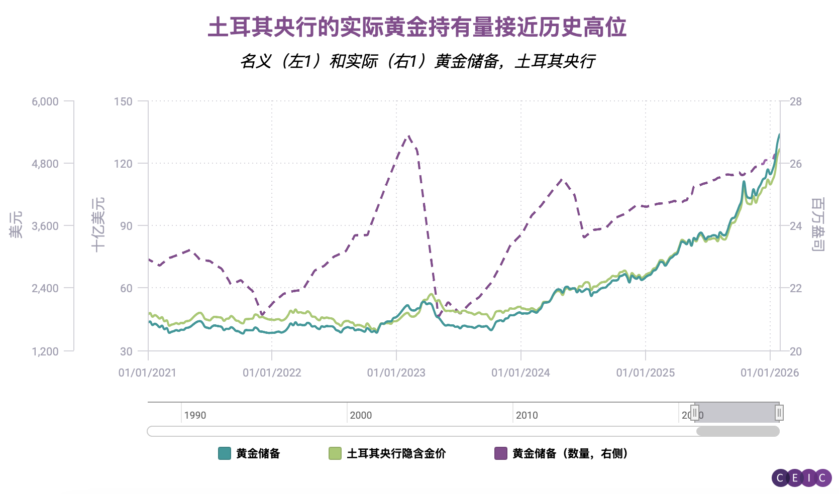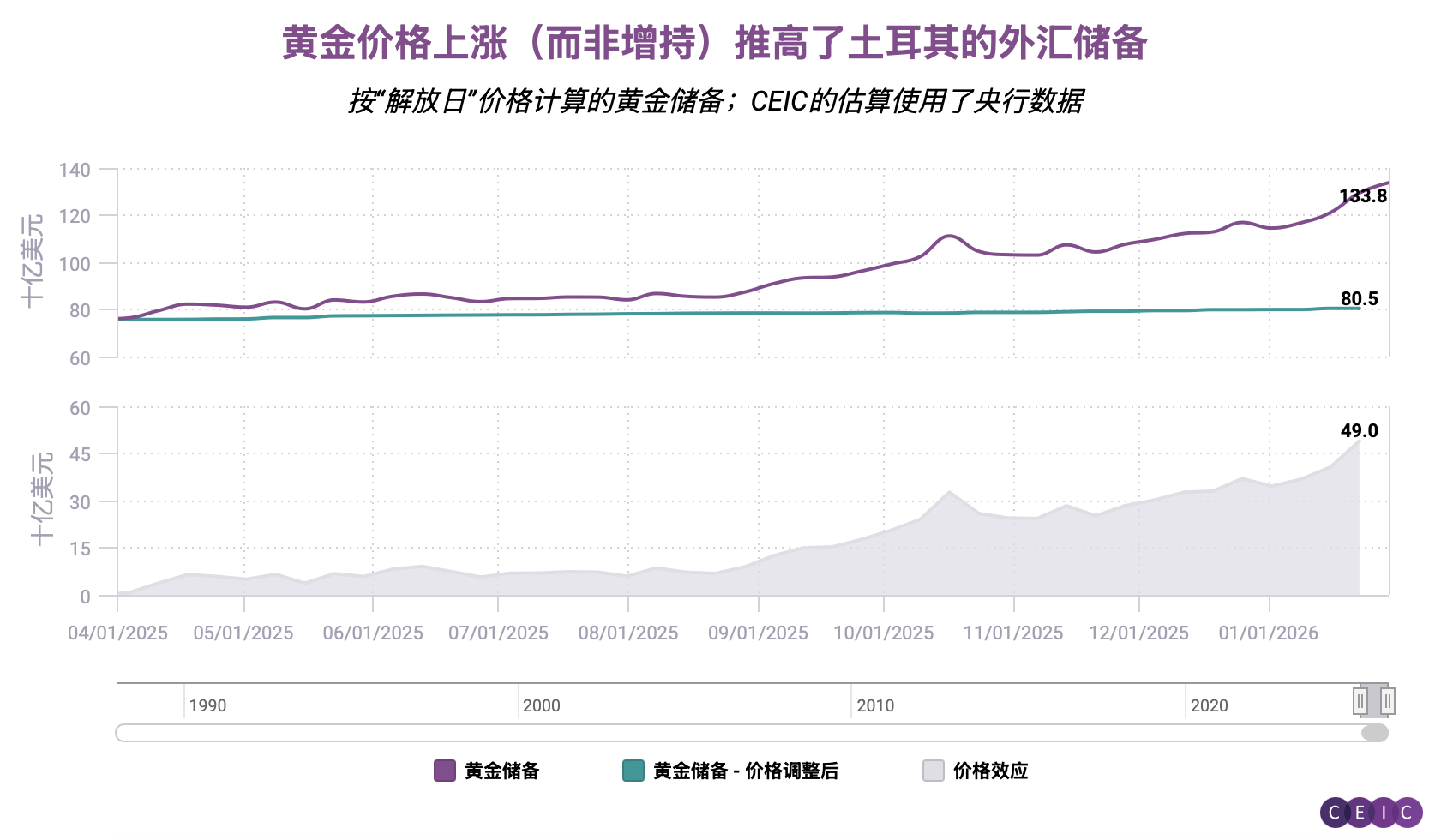 Home>文章>未分类>【CEIC数据透视】黄金推升土耳其央行储备【CEIC数据透视】黄金推升土耳其央行储备 CEIC 未分类 CEIC 2026年2月12日 under a minute read 土耳其央行成为本轮黄金价格大涨的显著受益者。土耳其不仅大幅增加了金融储备,更重要的是,随着土耳其央行在近年鹰派政策后试探性降息,金价上涨可以说巩固了央行的政策空间。 以下图表显示,自2024年初土耳其回归更为传统的经济政策以来,其外汇储备总额与净额均实现稳步攀升。截至1月23日,外汇储备总额达到2,156亿美元的历史新高;外汇储备净额也创下971亿美元的新纪录。(剔除外汇远期与期货头寸的外汇储备规模,同样达到 862 亿美元的历史高点。) 点击这里通过CEIC数据平台查看图表 诚然,当前仍处于高位的利率水平,以及新兴市场资金流整体向好的大环境,也为土耳其外汇储备的增长提供了助力。但为直观体现黄金对储备的显著拉动作用,本文另制作了两份图表,专门展示土耳其央行的黄金持有情况。 根据CEIC的计算,拆分黄金价格上涨与央行增持黄金的双重影响后可见:自2025年4月以来,黄金牛市已为土耳其央行储备贡献约490亿美元增长。(当时特朗普的 “解放日” 关税政策重创全球市场,加剧了市场对美元贬值的担忧,黄金的避险需求也随之再度升温。 下组图表显示,土耳其央行的黄金储备不仅名义规模实现增长,实际价值也同步走高,且目前仍维持在历史高位附近。 点击这里通过CEIC数据平台查看图表 点击这里通过CEIC数据平台查看图表 货币政策方面,土耳其央行近期延续宽松周期,但降息幅度小于部分观察人士的预期。由于通胀仍顽固维持在30%左右,央行的行动始终保持谨慎。 点击这里通过CEIC数据平台查看图表 即便如此,土耳其目前约 7% 的事后实际利率,已足以吸引国际投资者重回土耳其资产。以下图表引用EPFR资金流向数据绘制,已印证了这一点。 点击这里通过CEIC数据平台查看图表 今年以来,约有62亿美元的外国净资金流入土耳其股市,36亿美元流入国内政府债券。这两股资金流推动外资持有土耳其资产的总额创下约 614 亿美元的历史新高——尽管土耳其在全球新兴市场指数基准中的权重占比一直较低且变动不大。(EPFR数据显示,土耳其在新兴市场债券指数中的权重为 3.6%,在新兴市场股票指数中的权重仅为 0.6%。) 点击此链接获取完整版数据或申请CEIC试用。 Tags Recent Posts 【CEIC数据透视】沃什获美联储主席提名对市场产生的影响 CEIC 2026年2月28日 未分类 市场正在消化特朗普提名凯文·沃什执掌美联储的消息。美联储现任主席鲍威尔对宽松政策的谨慎态度屡遭特朗普批评。沃什是会延续昔日“通胀鹰派”的作风,还是推行与特朗普立场更贴合的政策?截至目前,芝加哥商业交易所(CME)的美联储观察工具FedWatch追踪的期货数据显示,市场已下调对美联储近期降息的预期,延续了沃什获任前便已显现的趋势。美元也随之走强。这或许反映出市场认为沃什不太可能推行超宽松政策,但也反映出一些令人意外的经济数据。点击这里通过CEIC数据平台查看图表1月初数据显示,美国通胀粘性超出预期。劳动力市场数据走强 Read More 【CEIC数据透视】马来西亚的退休挑战:储蓄与社会安全网 CEIC 2026年2月26日 未分类 2025年末,世界银行发出警示称马来西亚的退休保障体系面临风险——这反映了部分新兴市场正迅速遭遇发达国家长期应对的人口结构问题。预计到2056年,马来西亚65岁及以上人口比例将升至20%,而2045年这一比例将仅为14%。与此同时,马来西亚民众储蓄严重不足。本文根据雇员公积金(EPF)数据统计了马来西亚各年龄段的储蓄水平。马来西亚私营部门劳动者必须向EPF缴纳公积金,也可在法定供款基础上自愿追加储蓄。EPF为退休设定了“基本储蓄目标”:当前建议会员在55岁时应储蓄24万林吉特(约合6.1万美元)。该目标将于2030 Read More 【CEIC数据透视】阿根廷自由化政策推动进口增长,并取消对美关税 CEIC 2026年2月25日 未分类 阿根廷总统哈维尔·米莱刚刚签署一项美阿贸易协议,将打开阿根廷长期奉行保护主义的经济大门。数百项互惠关税将被削减,涵盖化学品和机械等类别,加剧阿根廷国内产业的竞争。(同时,更多阿根廷牛肉将出口至美国。)这是自由主义者米莱自2023年末上任以来推动贸易自由化的最新举措。他此前的关税削减措施旨在帮助抑制通胀,针对的是家电和iPhone等消费品。本文图表直观呈现阿根廷贸易自由化对经济各领域的影响。如以下图表所示,2025年阿根廷进口激增,并主要由消费品和资本货物拉动。汽车进口也占据显著位置。进口总额增速在2月触及40%峰值 Read More Sorry, no articles match the current filters. Sorry, no articles match the current search query.