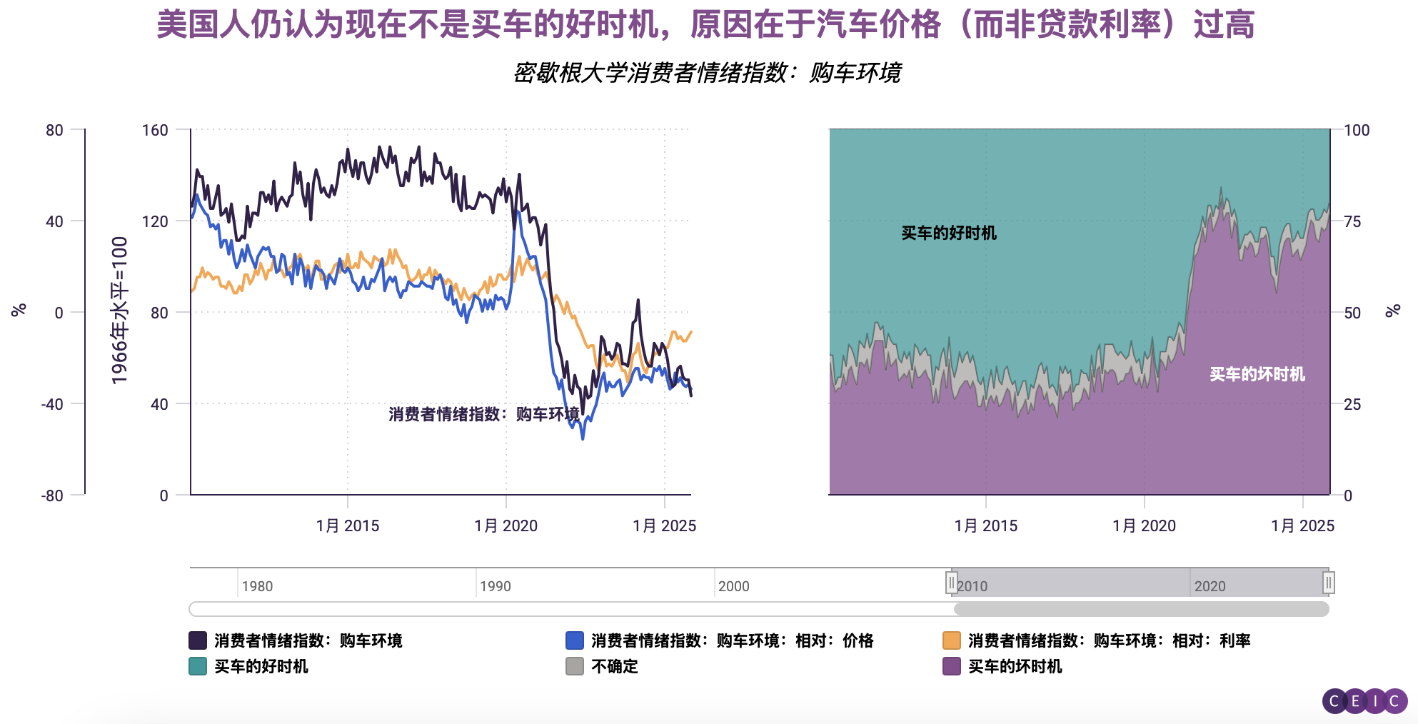接下来,我们观察密歇根大学的消费者信心指数及相关调查:尽管过去一年利率已转向下行(理论上应使车贷偿还压力远轻于2023年加息紧缩期),美国人仍认为当前并非购车良机(该观点已持续四年)。消费者普遍认为汽车标价过高(2023年也正是我们违约率图表中的关键转折点)。
