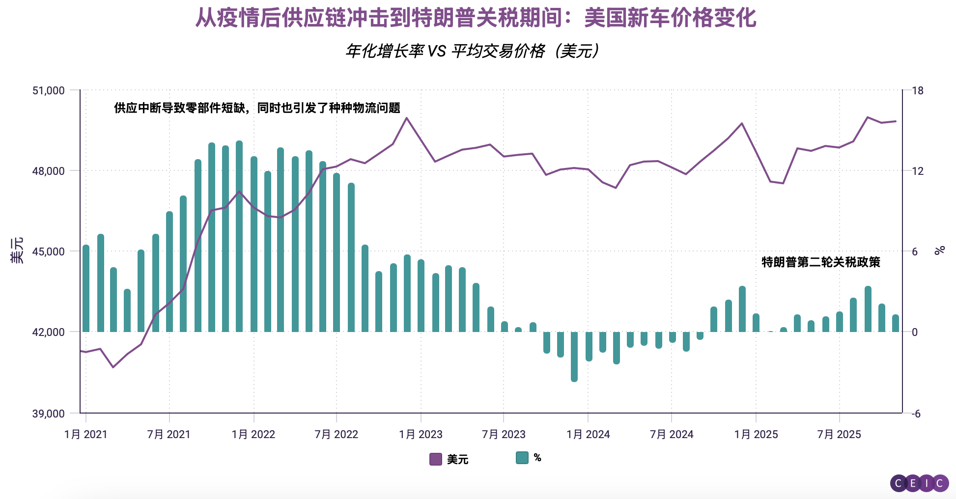 通过考克斯汽车公司的数据图表来解读消费者感知:10月新车平均交易价格维持在5万美元左右,这既反映了新冠疫情后供应链冲击对生产成本的持续影响,也体现了特朗普政府汽车关税政策的叠加效应。