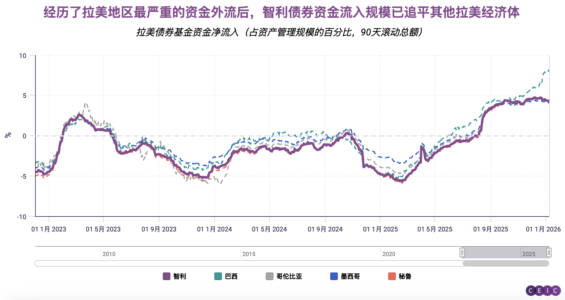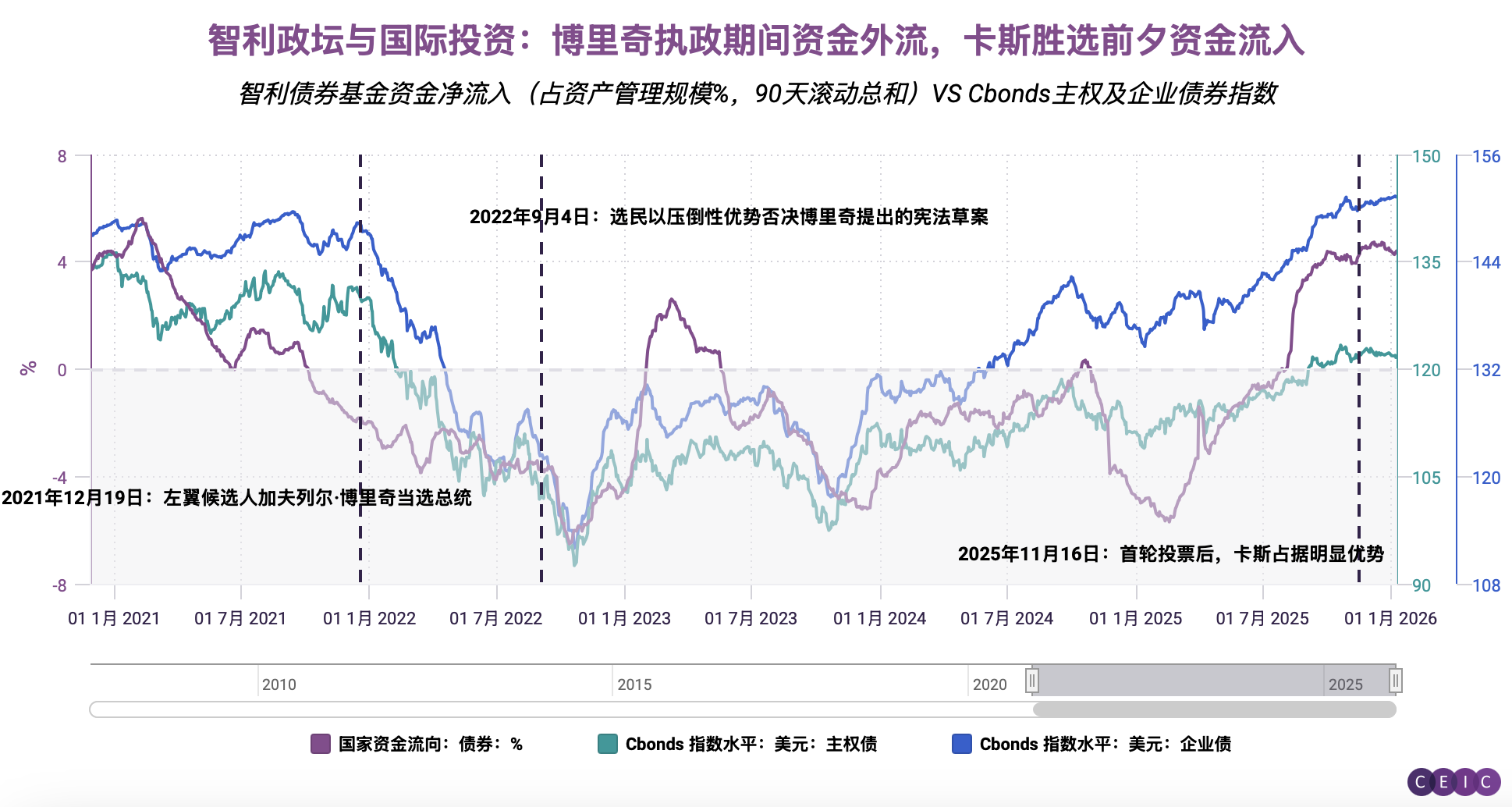 Home>文章>未分类>【CEIC数据透视】资金在总统大选前夕涌入智利【CEIC数据透视】资金在总统大选前夕涌入智利 CEIC 未分类 CEIC 2026年1月13日 under a minute read 智利总统大选12月14日落幕,反移民保守派候选人何塞・安东尼奥・卡斯击败共产党候选人珍妮特・哈拉,成功当选该国新一届总统。 由于市场普遍押注卡斯将获胜(截至12月2日,博彩平台Polymarket显示其胜选概率达96%),智利资产价格已大幅反弹。卡斯承诺将在18个月内削减60亿美元支出,并降低企业税以重振投资。这一表态扭转了现任总统加夫列尔·博里奇执政初期的资本外流局面。 本文使用CEIC深度合作伙伴EPFR的独家资金流数据,揭示投资者仓位配置的决定性转变。 如以下图表所示,债券投资者自2025年中期开始积极买入智利资产,押注大选将出现利好商业的结果。我们将此趋势与Cbonds指数对比(后者捕捉到了近期企业债和主权债的反弹),发现两类指数年内涨幅均约为10%。 点击这里通过CEIC数据平台查看图表 以下图表呈现整个美洲大陆视角。经历博里奇执政早期的资金外流后,智利当前资金流入规模已追平拉美其他国家。 点击这里通过CEIC数据平台查看图表 EPFR数据还显示,全球新兴市场的主动型基金经理已显著提高智利债券配置权重,这是一项重大转折——此前多年,此类基金经理始终低配智利资产。 点击这里通过CEIC数据平台查看图表 纵观智利宏观指标与金融市场表现,投资者正重新将其视为地区避险港湾。智利当前提供的实际收益率(定义为10年期国债收益率减去通胀率)不仅是拉美最低,在主要新兴市场中也处于低位。在经历博里奇2022-2023年修宪行动引发的市场波动后,智利政府债务违约保险成本已降至接近疫情后低点;其信用违约互换利差也与邻国秘鲁呈现分化。 点击这里通过CEIC数据平台查看图表 点击这里通过CEIC数据平台查看图表 这一背景为智利央行12月16日降息提供了支撑。当前通胀率已回落至政策制定者设定的2-4%目标区间内。 最后,我们回顾此前探讨过的一个主题:铜价与智利股票资金流入的关联。今年铜价保持强劲走势,作为全球最大铜生产国,智利股市自2025年年中以来也迎来股票资金流入激增。 点击这里通过CEIC数据平台查看图表 点击此链接获取完整版数据或申请CEIC试用。 Tags Recent Posts 【CEIC数据透视】沃什获美联储主席提名对市场产生的影响 CEIC 2026年2月28日 未分类 市场正在消化特朗普提名凯文·沃什执掌美联储的消息。美联储现任主席鲍威尔对宽松政策的谨慎态度屡遭特朗普批评。沃什是会延续昔日“通胀鹰派”的作风,还是推行与特朗普立场更贴合的政策?截至目前,芝加哥商业交易所(CME)的美联储观察工具FedWatch追踪的期货数据显示,市场已下调对美联储近期降息的预期,延续了沃什获任前便已显现的趋势。美元也随之走强。这或许反映出市场认为沃什不太可能推行超宽松政策,但也反映出一些令人意外的经济数据。点击这里通过CEIC数据平台查看图表1月初数据显示,美国通胀粘性超出预期。劳动力市场数据走强 Read More 【CEIC数据透视】马来西亚的退休挑战:储蓄与社会安全网 CEIC 2026年2月26日 未分类 2025年末,世界银行发出警示称马来西亚的退休保障体系面临风险——这反映了部分新兴市场正迅速遭遇发达国家长期应对的人口结构问题。预计到2056年,马来西亚65岁及以上人口比例将升至20%,而2045年这一比例将仅为14%。与此同时,马来西亚民众储蓄严重不足。本文根据雇员公积金(EPF)数据统计了马来西亚各年龄段的储蓄水平。马来西亚私营部门劳动者必须向EPF缴纳公积金,也可在法定供款基础上自愿追加储蓄。EPF为退休设定了“基本储蓄目标”:当前建议会员在55岁时应储蓄24万林吉特(约合6.1万美元)。该目标将于2030 Read More 【CEIC数据透视】阿根廷自由化政策推动进口增长,并取消对美关税 CEIC 2026年2月25日 未分类 阿根廷总统哈维尔·米莱刚刚签署一项美阿贸易协议,将打开阿根廷长期奉行保护主义的经济大门。数百项互惠关税将被削减,涵盖化学品和机械等类别,加剧阿根廷国内产业的竞争。(同时,更多阿根廷牛肉将出口至美国。)这是自由主义者米莱自2023年末上任以来推动贸易自由化的最新举措。他此前的关税削减措施旨在帮助抑制通胀,针对的是家电和iPhone等消费品。本文图表直观呈现阿根廷贸易自由化对经济各领域的影响。如以下图表所示,2025年阿根廷进口激增,并主要由消费品和资本货物拉动。汽车进口也占据显著位置。进口总额增速在2月触及40%峰值 Read More Sorry, no articles match the current filters. Sorry, no articles match the current search query.