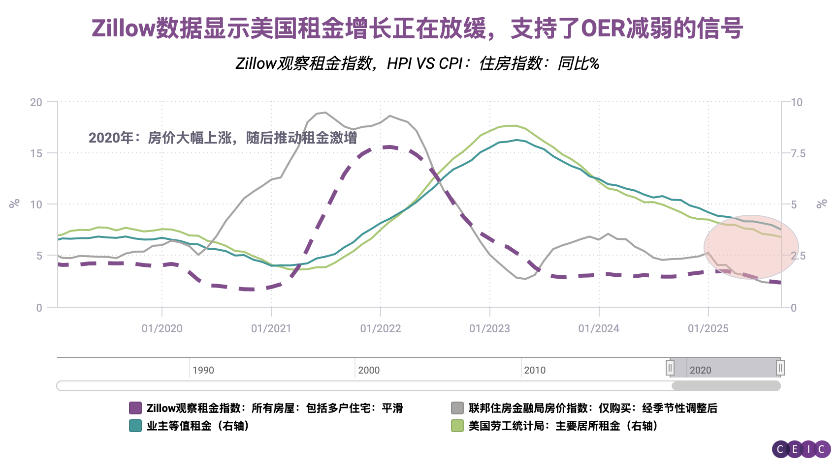 Home>文章>未分类>【CEIC数据透视】业主等价租金(OER):美国住房通胀的争议性指标急剧放缓【CEIC数据透视】业主等价租金(OER):美国住房通胀的争议性指标急剧放缓 CEIC 未分类 CEIC 2025年11月20日 under a minute read 在衡量通胀时,住房成本是一个关键且有时颇具争议的组成部分。鉴于房产价格被视为反映投资而非消费,美国劳工统计局编制了“业主等价租金(OER)”这一指标,通过调查业主若出租自有住房可能收取的租金来计算。该组成部分约占美国整体CPI的26%。 出于多种原因,批评者认为这种调查方法可能导致通胀数据失真。部分观察人士在评估消费价格走势(进而影响货币政策)时倾向于剔除住房组成部分。然而,美国9月通胀数据略低于经济学家预期——原因之一是OER的数据异常疲软,脱离了近期趋势。 以下图表绘制了过去二十年的OER走势图。9月,OER的年化环比增速从8月的4.7%急剧放缓至1.6%。近几十年来类似程度的放缓仅出现在全球金融危机和新冠疫情期间。 点击这里通过CEIC数据平台查看图表 这种急剧放缓意味着什么?在整体通胀仍具粘性的背景下(9月3%的CPI涨幅仍是1月以来最高水平),这只是一个异常值,还是为进一步降息提供了依据?为深入分析,我们将OER与美国知名房地产网站Zillow提供的另类住房数据进行了对比。 正如此图表所示,Zillow的租金指数正在放缓;房价涨幅也在趋稳。(历史上Zillow这类实际租金数据通常是OER变化的领先指标。) 点击这里通过CEIC数据平台查看图表 最后一张图表我们注意到,尽管如此,9月3%的通胀数据仍抑制了降息预期。在10月24日数据公布后数日,CME的FedWatch工具显示,市场对美联储在12月FOMC会议后将关键利率维持在3.75%-4.00%的概率略有上升。美联储10月29日降息后,主席鲍威尔相对鹰派的表态强化了这一预期——期货市场最近定价显示,美联储维持利率不变的概率已达38%。 点击这里通过CEIC数据平台查看图表 点击此链接获取完整版数据或申请CEIC试用。 Tags Recent Posts 【CEIC数据透视】沃什获美联储主席提名对市场产生的影响 CEIC 2026年2月28日 未分类 市场正在消化特朗普提名凯文·沃什执掌美联储的消息。美联储现任主席鲍威尔对宽松政策的谨慎态度屡遭特朗普批评。沃什是会延续昔日“通胀鹰派”的作风,还是推行与特朗普立场更贴合的政策?截至目前,芝加哥商业交易所(CME)的美联储观察工具FedWatch追踪的期货数据显示,市场已下调对美联储近期降息的预期,延续了沃什获任前便已显现的趋势。美元也随之走强。这或许反映出市场认为沃什不太可能推行超宽松政策,但也反映出一些令人意外的经济数据。点击这里通过CEIC数据平台查看图表1月初数据显示,美国通胀粘性超出预期。劳动力市场数据走强 Read More 【CEIC数据透视】马来西亚的退休挑战:储蓄与社会安全网 CEIC 2026年2月26日 未分类 2025年末,世界银行发出警示称马来西亚的退休保障体系面临风险——这反映了部分新兴市场正迅速遭遇发达国家长期应对的人口结构问题。预计到2056年,马来西亚65岁及以上人口比例将升至20%,而2045年这一比例将仅为14%。与此同时,马来西亚民众储蓄严重不足。本文根据雇员公积金(EPF)数据统计了马来西亚各年龄段的储蓄水平。马来西亚私营部门劳动者必须向EPF缴纳公积金,也可在法定供款基础上自愿追加储蓄。EPF为退休设定了“基本储蓄目标”:当前建议会员在55岁时应储蓄24万林吉特(约合6.1万美元)。该目标将于2030 Read More 【CEIC数据透视】阿根廷自由化政策推动进口增长,并取消对美关税 CEIC 2026年2月25日 未分类 阿根廷总统哈维尔·米莱刚刚签署一项美阿贸易协议,将打开阿根廷长期奉行保护主义的经济大门。数百项互惠关税将被削减,涵盖化学品和机械等类别,加剧阿根廷国内产业的竞争。(同时,更多阿根廷牛肉将出口至美国。)这是自由主义者米莱自2023年末上任以来推动贸易自由化的最新举措。他此前的关税削减措施旨在帮助抑制通胀,针对的是家电和iPhone等消费品。本文图表直观呈现阿根廷贸易自由化对经济各领域的影响。如以下图表所示,2025年阿根廷进口激增,并主要由消费品和资本货物拉动。汽车进口也占据显著位置。进口总额增速在2月触及40%峰值 Read More Sorry, no articles match the current filters. Sorry, no articles match the current search query.