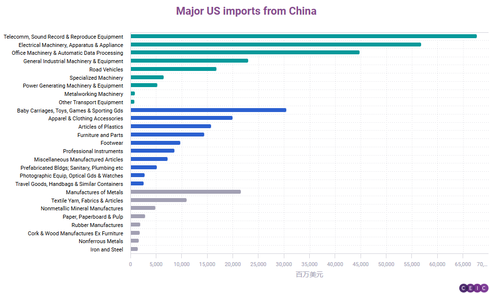 过去五年,中国对美国的出口增长缓慢,但制成品仍然占据中国出口的主导地位。2024年,中国运往美国的货物中,近90%都是制成品,其中电子产品、办公机械、玩具、运动用品和服装是主要品类。