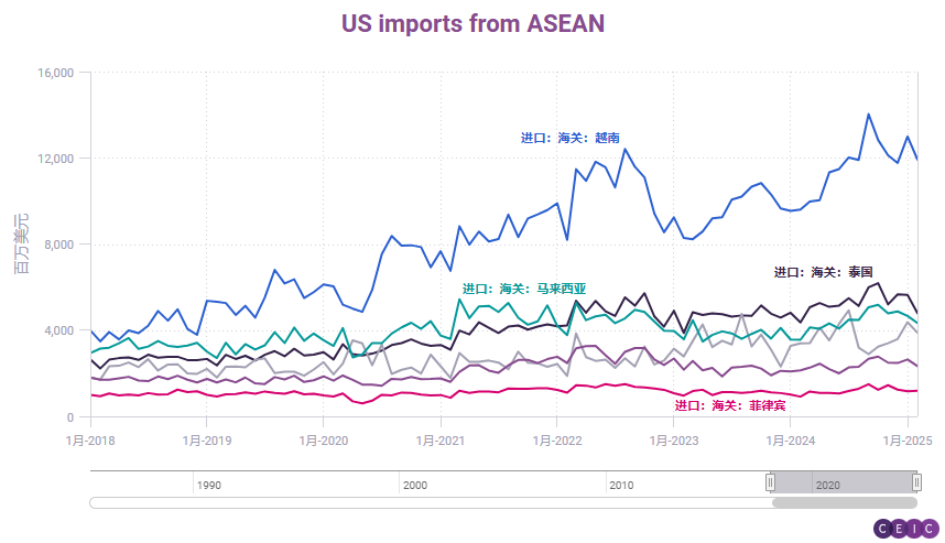 随着国际贸易格局的变化,东盟中的“连接型经济体”之一越南成为了最大的受益者。越南推动了东盟整体对美国的出口。2019年,越南对美国的出口额为660亿美元,而到了2024年,这一数字已经翻倍至1360亿美元。