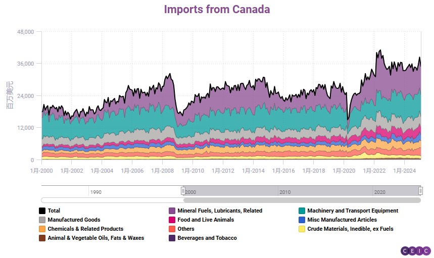 在以下图表中,汽车公司被归类于“机械和运输设备”,这是美国从加拿大进口商品中的第二大类。最大的类别是“矿物燃料”,包括石油和天然气。